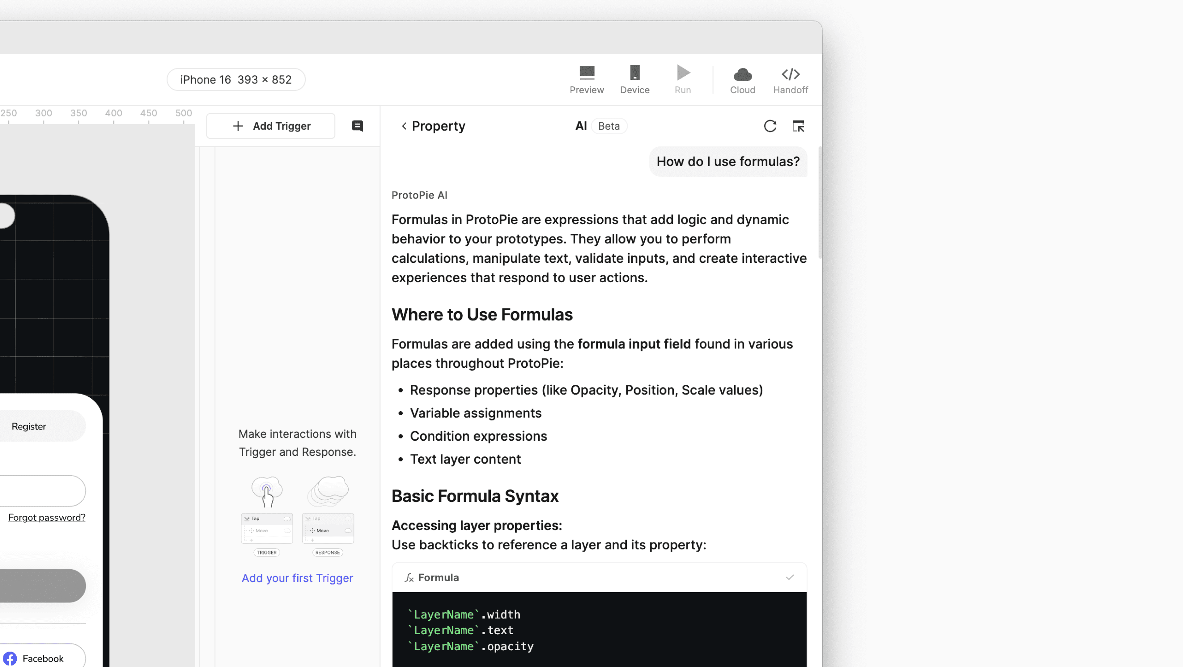 ProtoPieではAIを独立したレイヤーにするのではなく、既存のインタラクションシステムに直接統合しました。AIが生成した動作は、手動で作業する際と同じトリガー(Trigger)とレスポンス(Response)のロジックを使用します。すべてのインタラクションは編集、確認、拡張が可能です。修正不可能な「ロックされた成果物(Locked outputs)」は存在しません。