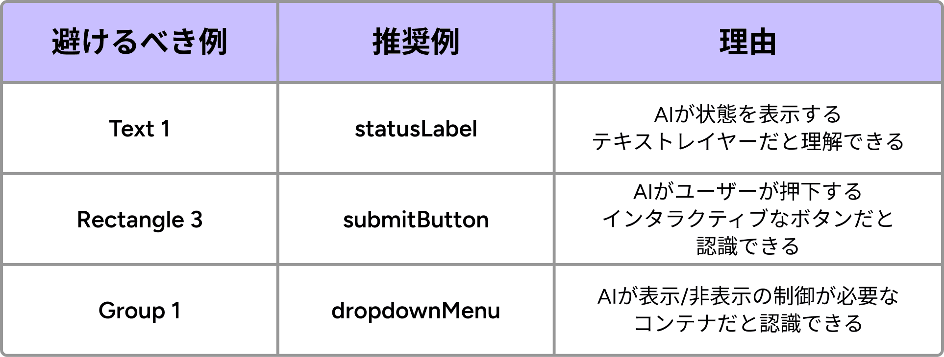 プロの活用コツ: camelCase(例: loginButton)や snake_case(例: login_button)など、命名規則を一貫させるとAIの認識精度がさらに向上します。