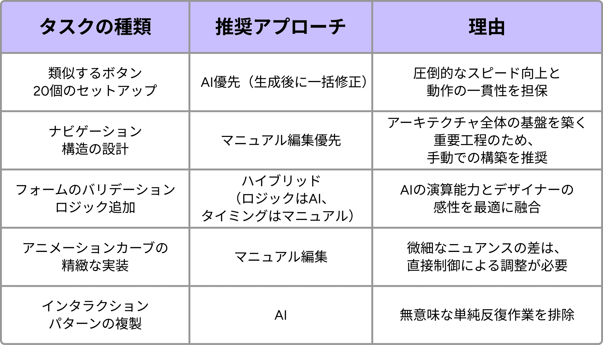 例: フォーム10個のバリデーションロジックはAIを使って2分で終わらせ、エラーメッセージが表示されるアニメーションのタイミングは、ユーザーの手で精緻に作り込む(約3分)。