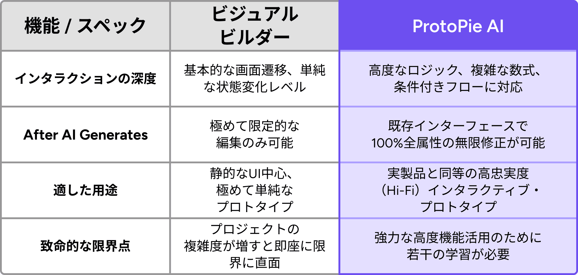 ProtoPie AI vs ビジュアルビルダー(例:Figma AI, Framer AIなど)