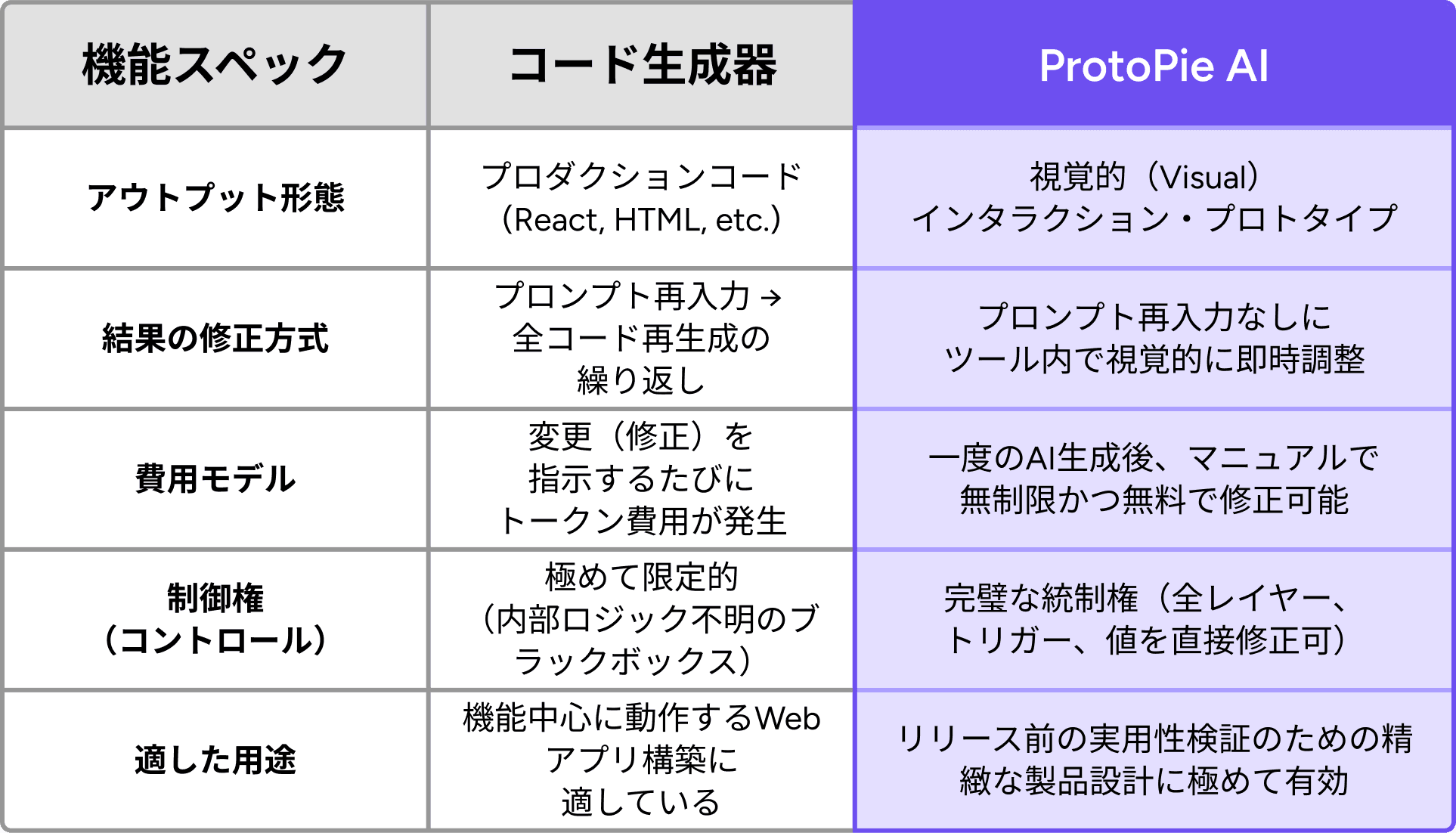 ProtoPie AI vs コード生成器(Cursor, v0など)