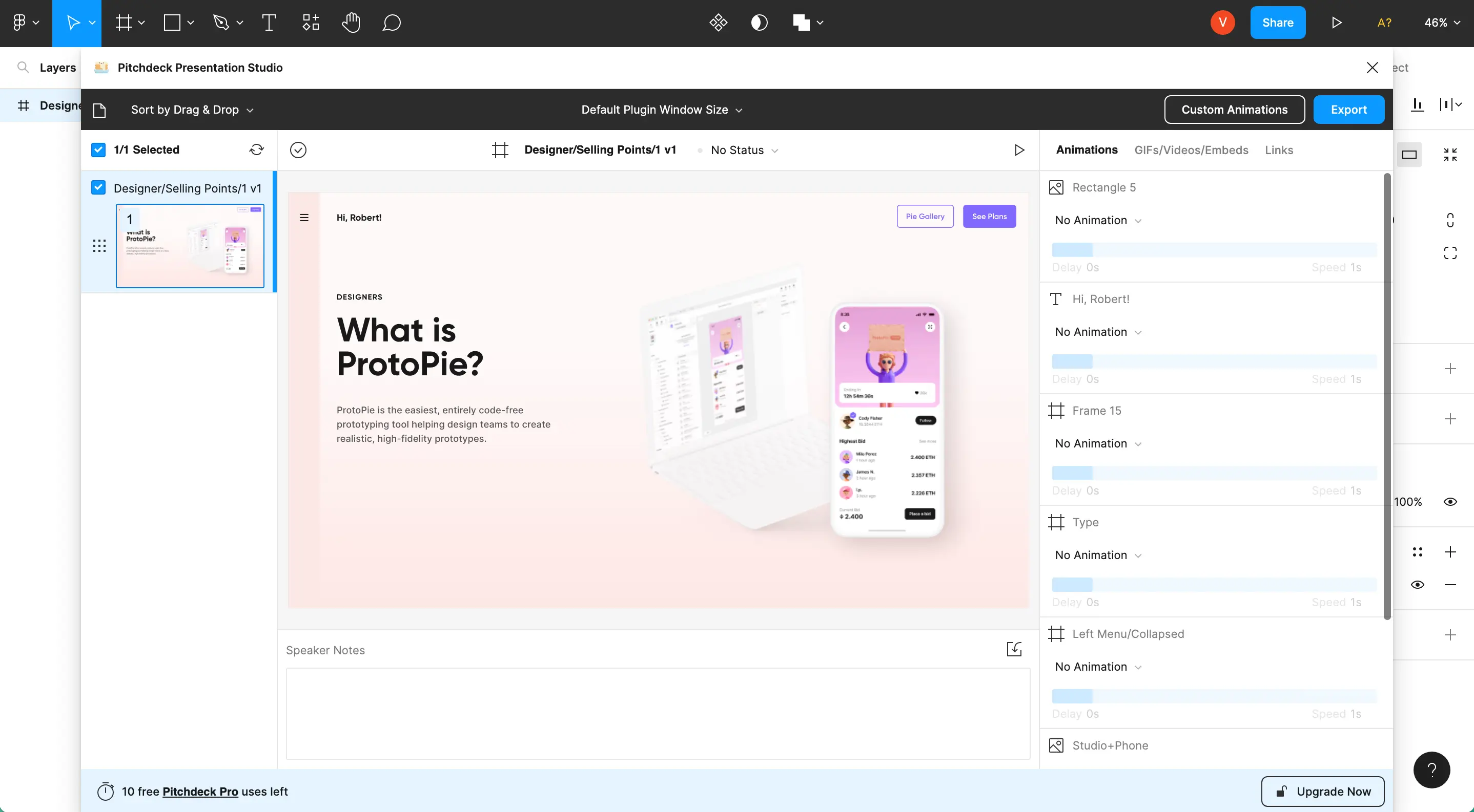 Figma用のPitchdeck Presentation Studioプラグインを使用すると、Figma上で簡単にプレゼンテーションを作成でき、Figma上でアニメーションやリアルタイムのプレビューをサポートします。プレゼンテーションは、PowerPoint、Keynote、Google スライド、PDF など、さまざまなファイル形式にエクスポートでき、Loom、Canva、Lottie、Spotify などのリソースを埋め込むことも可能です。
