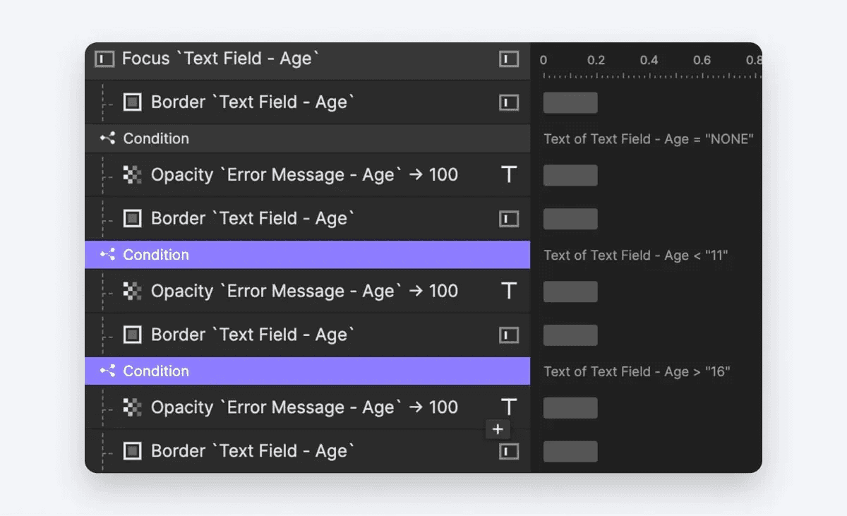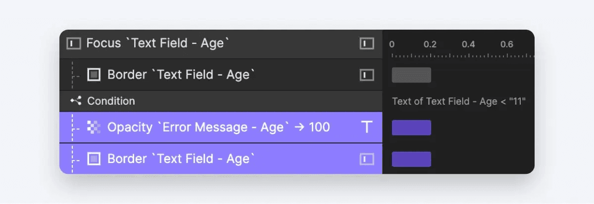 条件が満たされるとエラーメッセージを表示します。「Error Message - Age」レイヤーに「不透明度」応答を追加して不透明度を100に設定します。