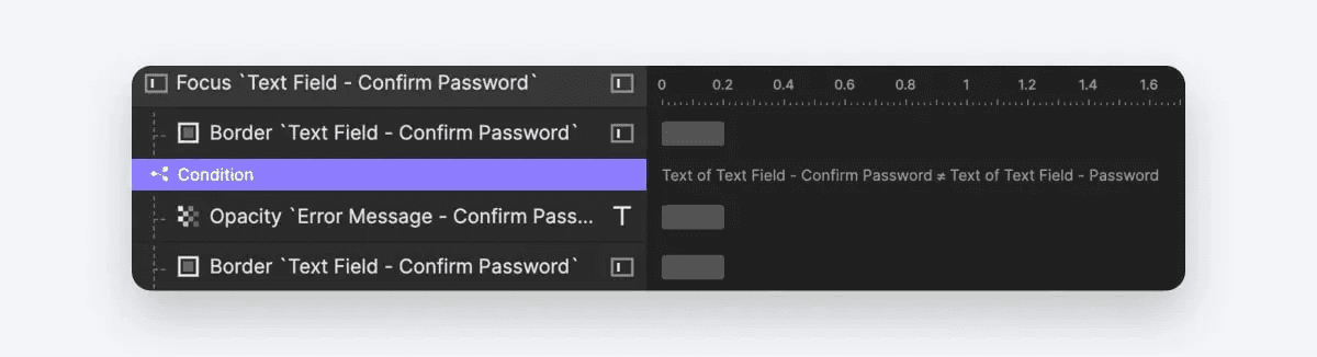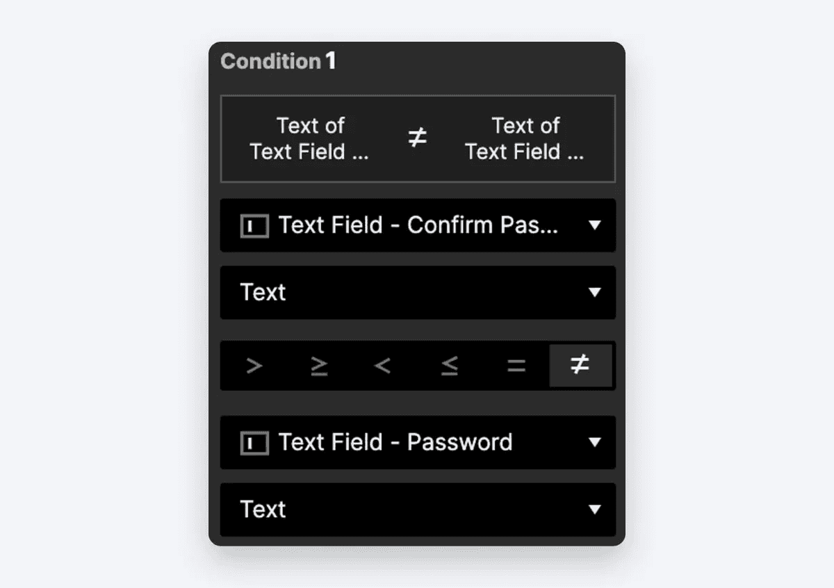 「Text Field - Confirm Password」のテキストが「Text Field - Password」のテキストと異なる場合を確認する条件を追加します。