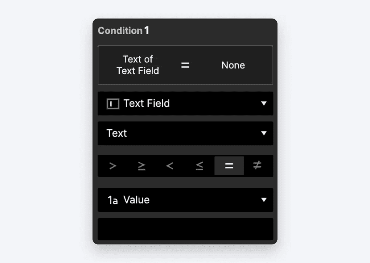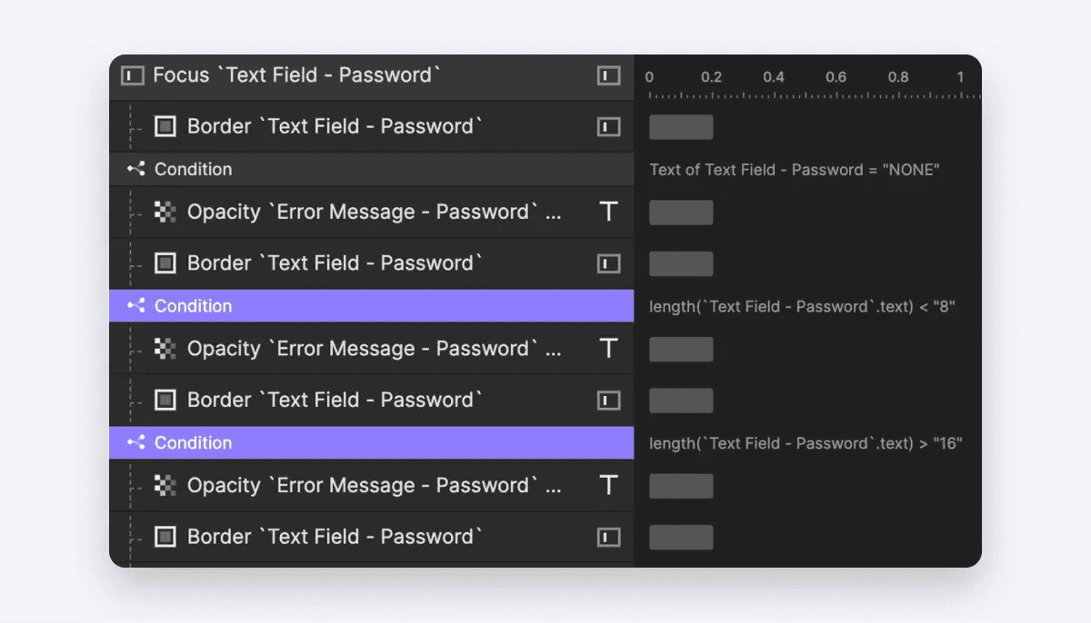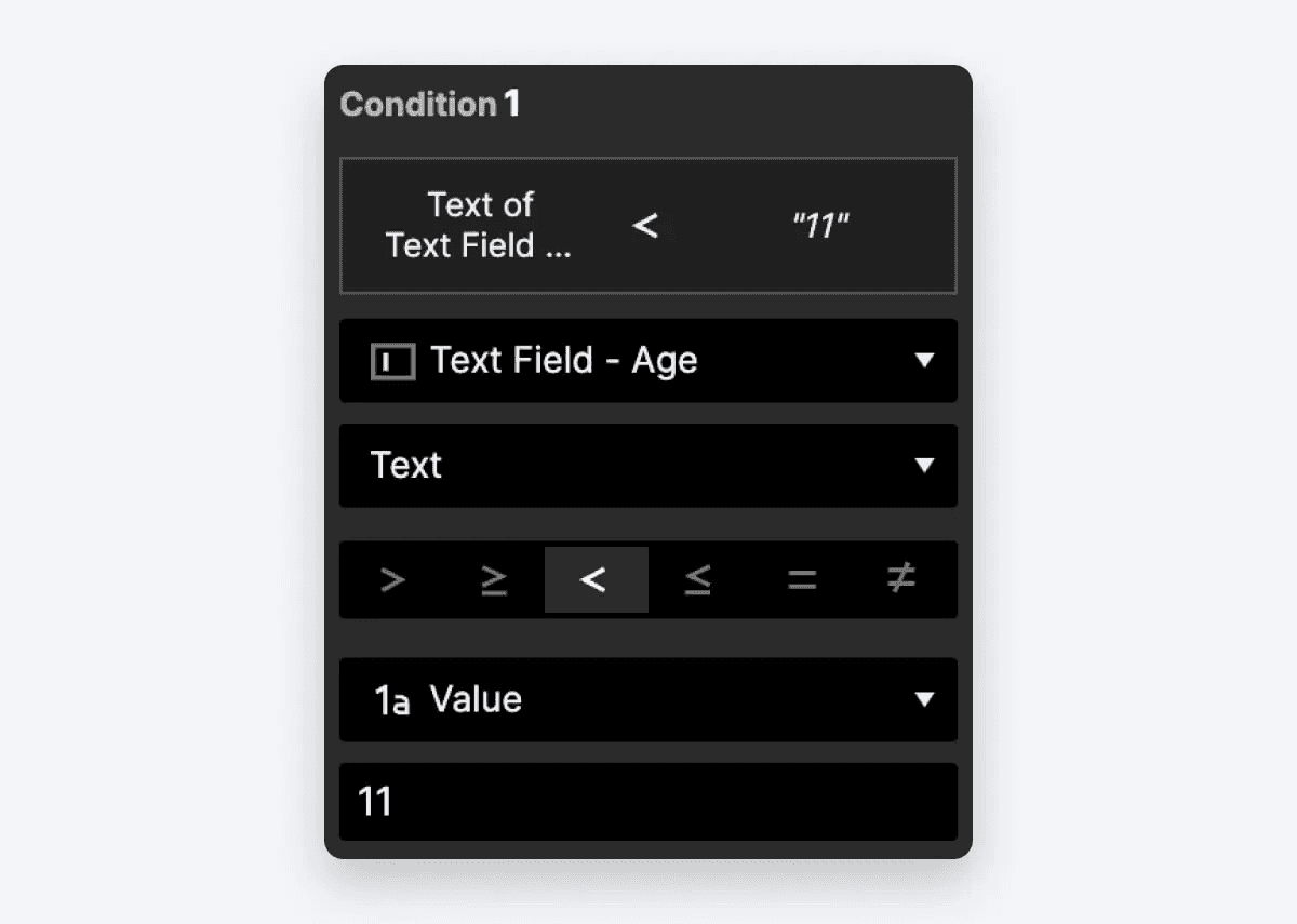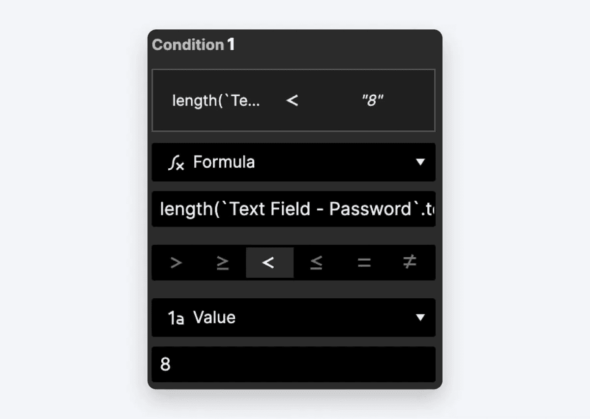 length(`Text Field - Password`.text) < 8を使用します。length()は ProtoPie の関数で、文字列の長さをチェックします。