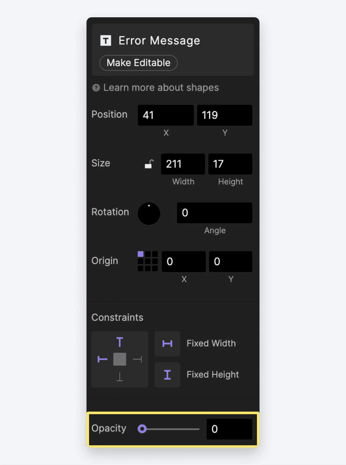 「Error Message」レイヤーに「不透明度」応答を追加して不透明度を100に設定します。