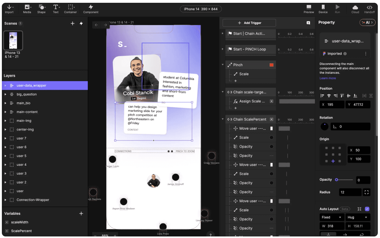 ProtoPieでスムーズかつ精巧なインタラクションを実装するには、最新のインタラクションデザインの核となる「ロジックファースト(Logic-first)」の思考でアプローチすることをお勧めします。ProtoPieのFigmaプラグインを使えば、デザインデータをシームレスにインポートし、準備が整い次第すぐにProtoPie Studio上で動作を確認できるため、このアプローチを非常にスムーズに実践できます。