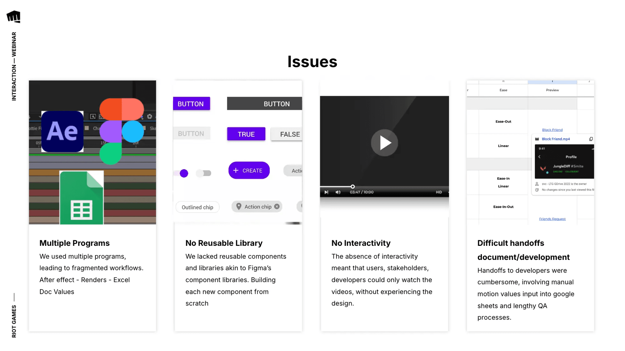 ProtoPieを導入する前、Riot Gamesのプロトタイピングプロセスは多くの企業と同様のワークフローを持っていました。これは、Figmaでデザインを開始し、AEUXなどのプログラムを通じて転送し、After Effectsで最終作業を完了する方式でした。このワークフローは、長いレンダリングおよびプレビュー時間のために、いくつかの課題を引き起こしていました: